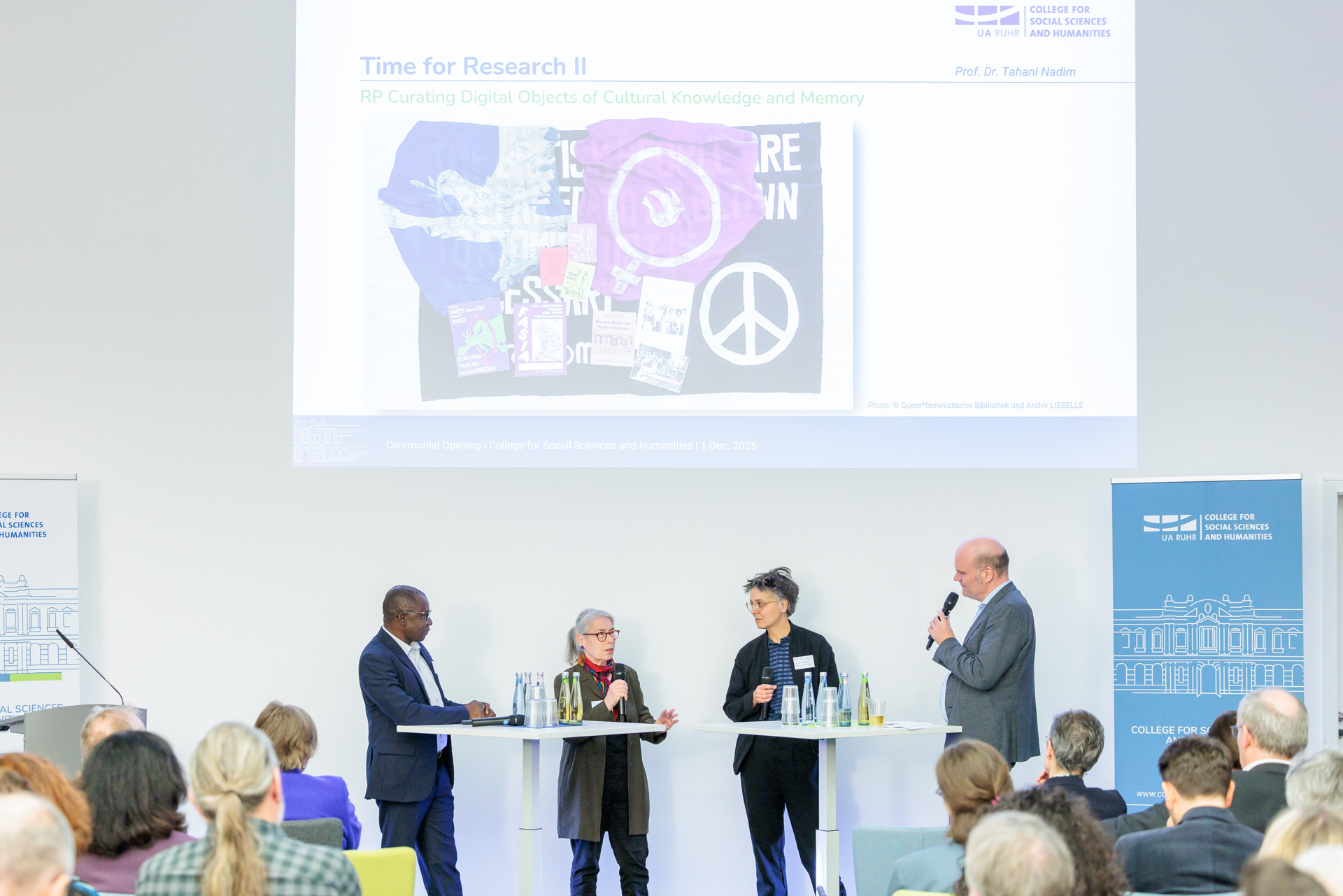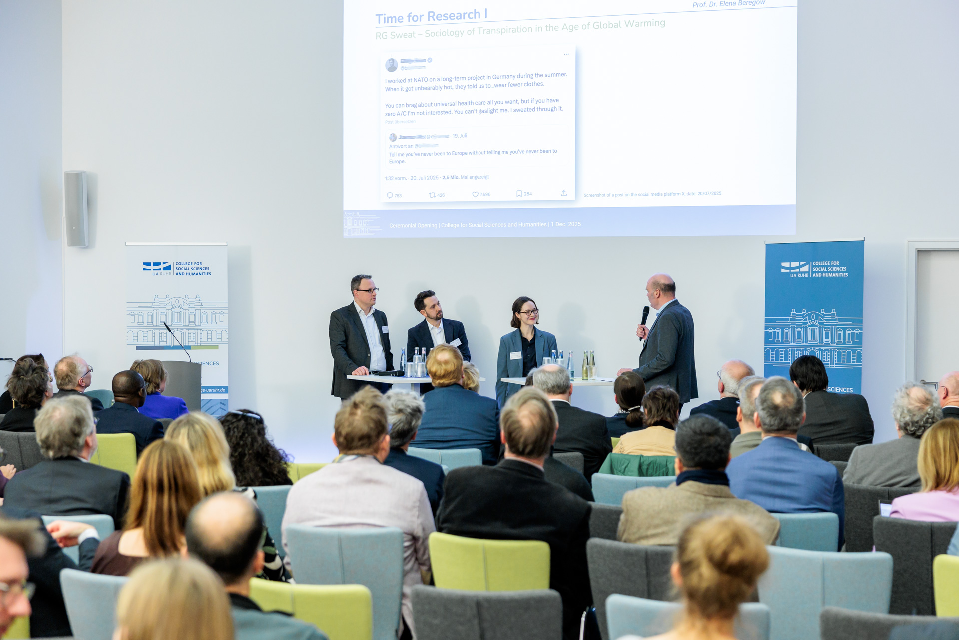 At the ceremonial opening on 1 December, the professors of the College provided insights into their research fields. For instance, Prof. Dr Tahani Nadim – in dialogue with civil society and archives – investigates how memory culture and curatorial practices are changing through digital technologies. Another focus is on environmental humanities, which examine the social and cultural aspects of environmental transformation. In three research groups, the junior professors Dr Elena Beregow, Dr Florian Fastenrath and Dr Matthias Kranke are exploring, among other aspects, how we culturally deal with (increasing) sweating in times of climate change, whether sustainability can be governed globally, and how politics addresses social inequality.