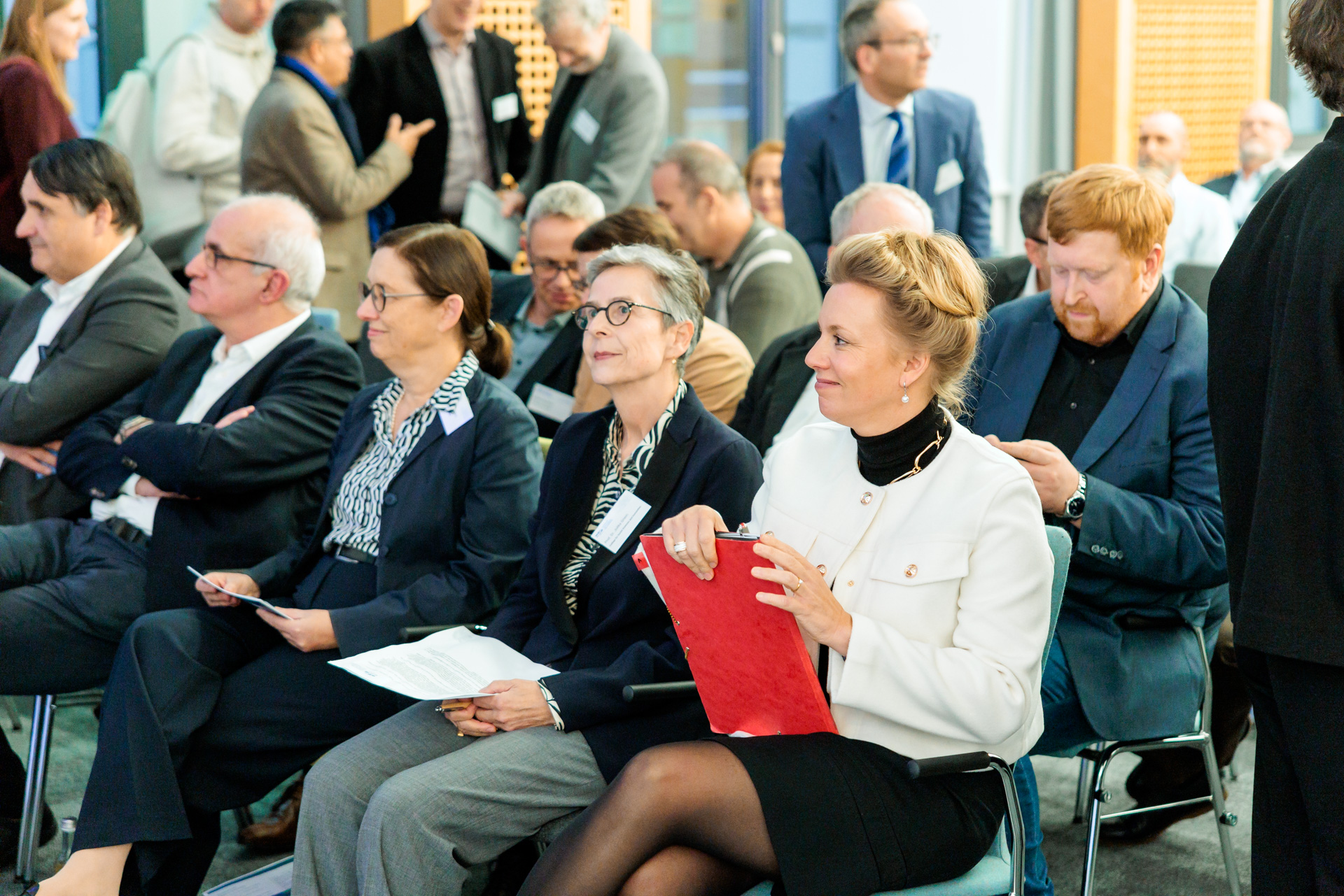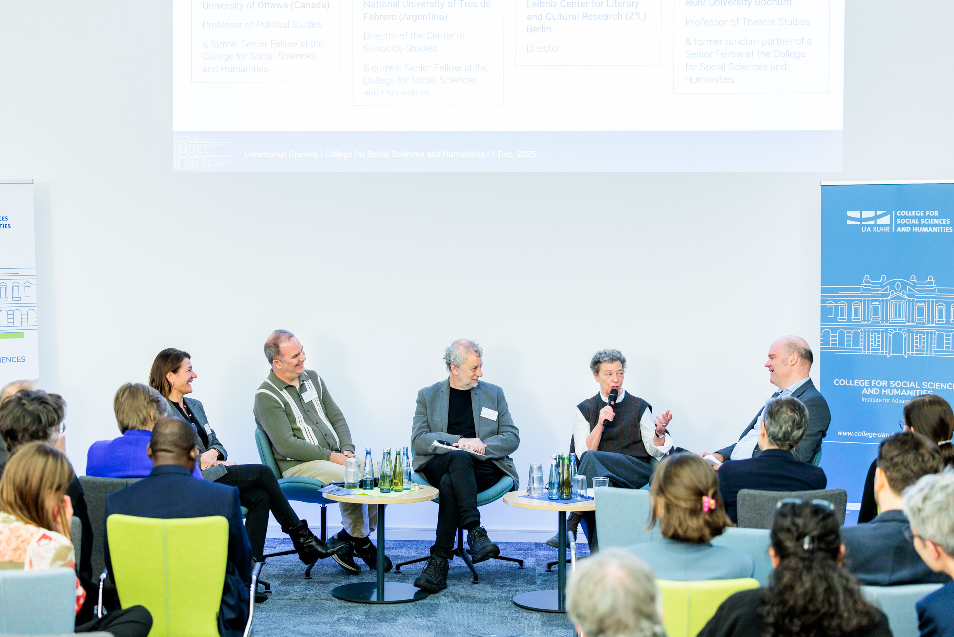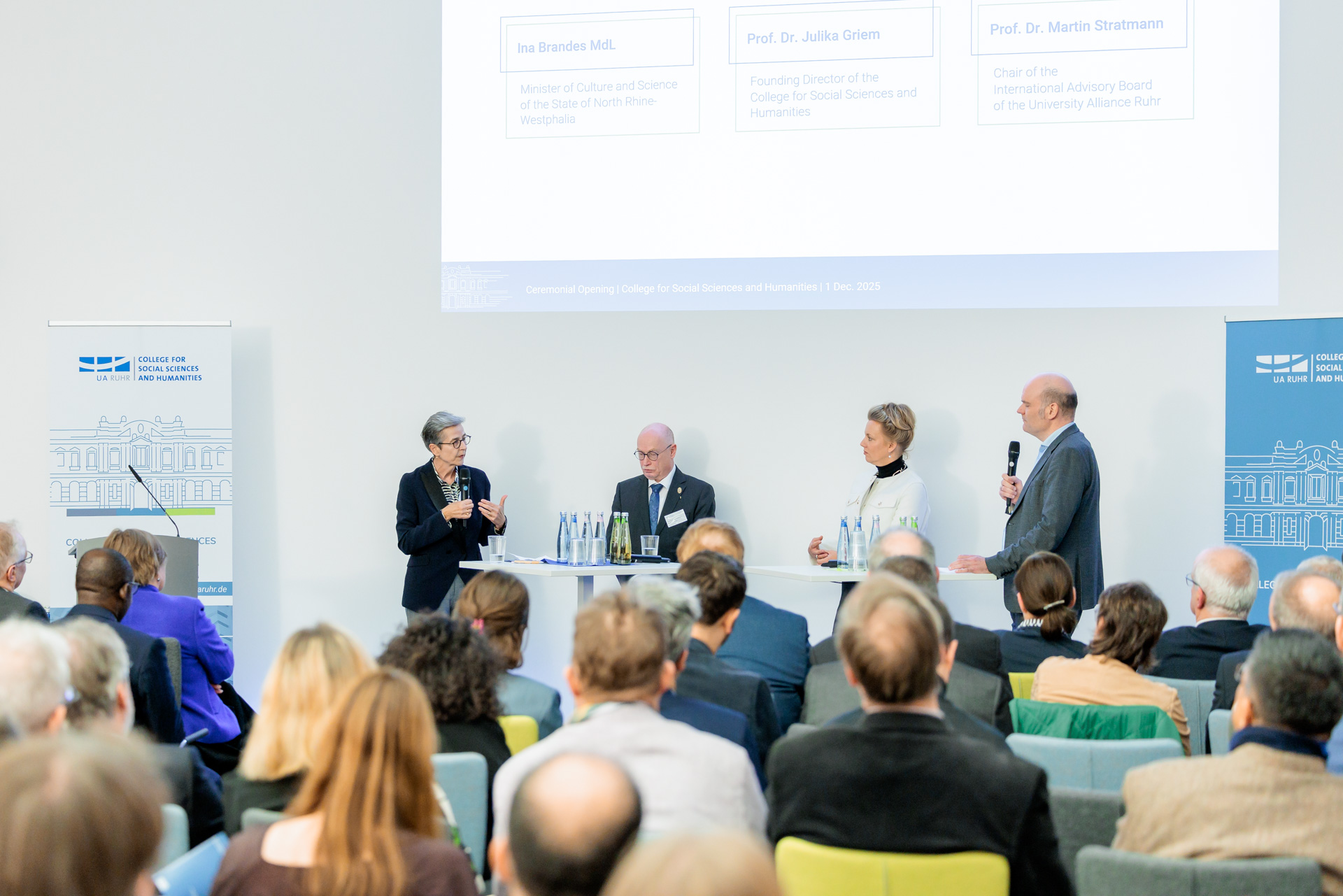 Prof. Martin Paul (Rector of Ruhr University Bochum), Ina Brandes (Minister of Culture and Science of North-Rhine Westphalia), Prof. Julika Griem (Director of the College), Prof. Barbara Albert (Rector of University of Duisburg-Essen), Prof. Ute Schneider (Scientific Board member of the College), Prof. Friedrich Balke (Scientific Board member of the College), Prof. Maximiliane Wilkesmann (Scientific Board member of the College), Prof. Manfred Bayer (Rector of TU Dortmund University)
